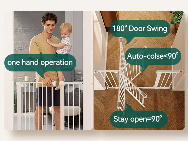 The door gently swings shut behind you with its auto-close feature and includes a stay-open mode for flexible access. Dual-direction entry and one-hand operation offer daily ease for busy parents.