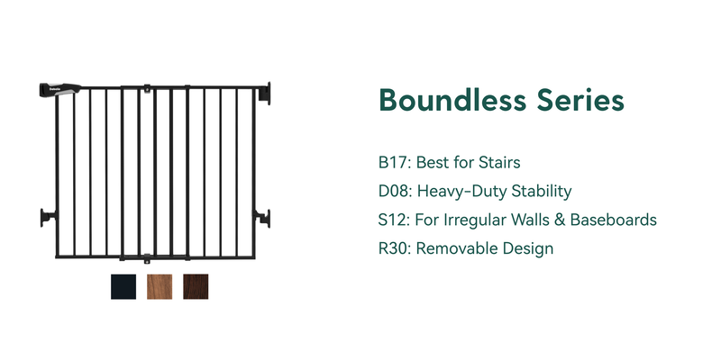 Securely screwed into walls for maximum stability. The safest choice for the top of stairs. (Includes Boundless Series)