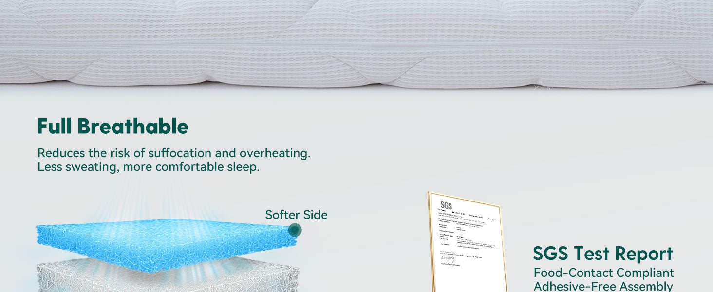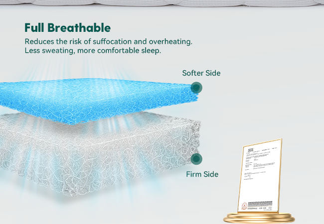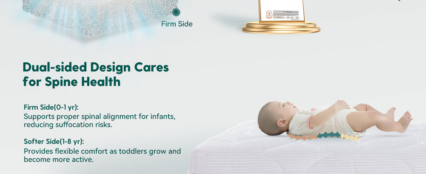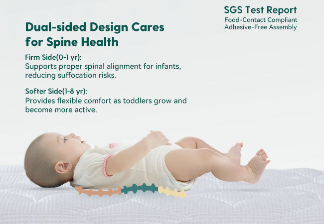 The firm, transparent side supports newborn spinal development, while the softer blue side cushions toddlers, relieving pressure and promoting healthy spine alignment as they grow.