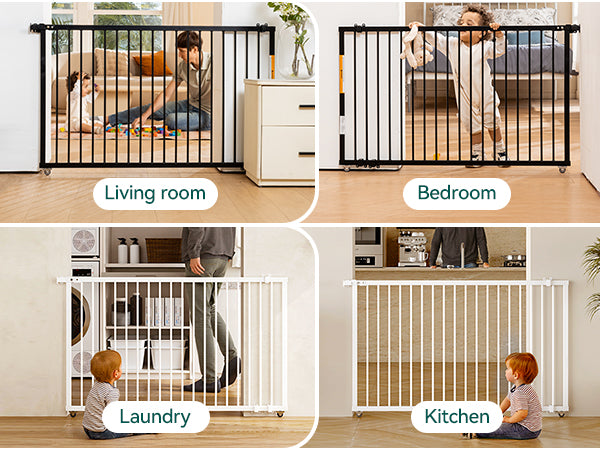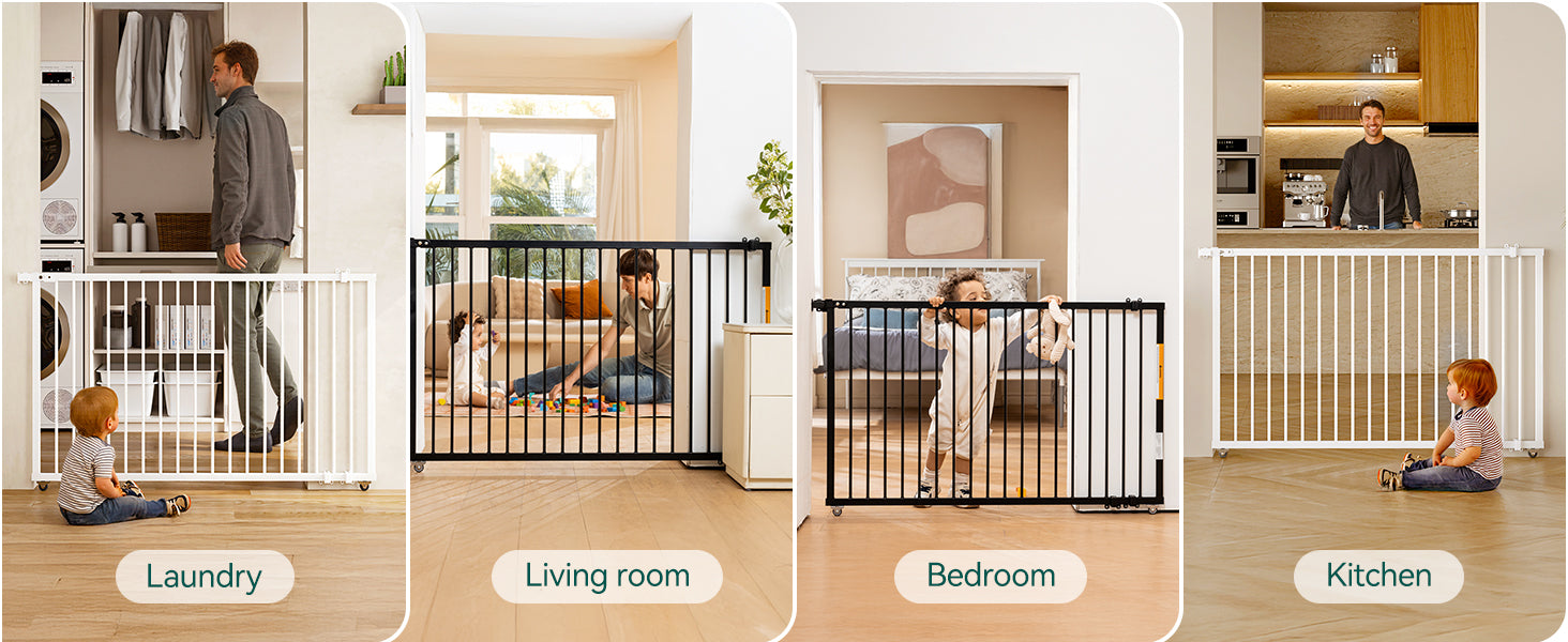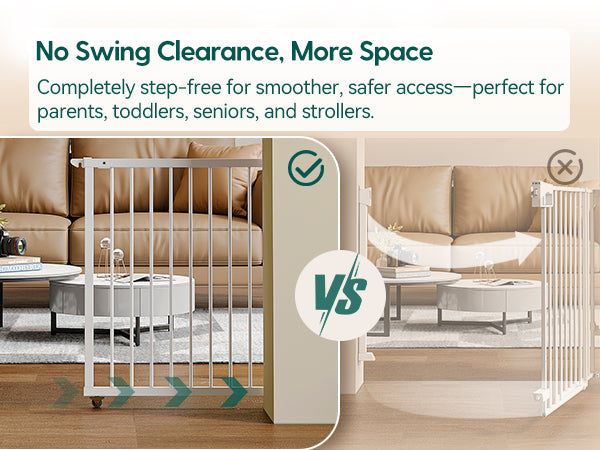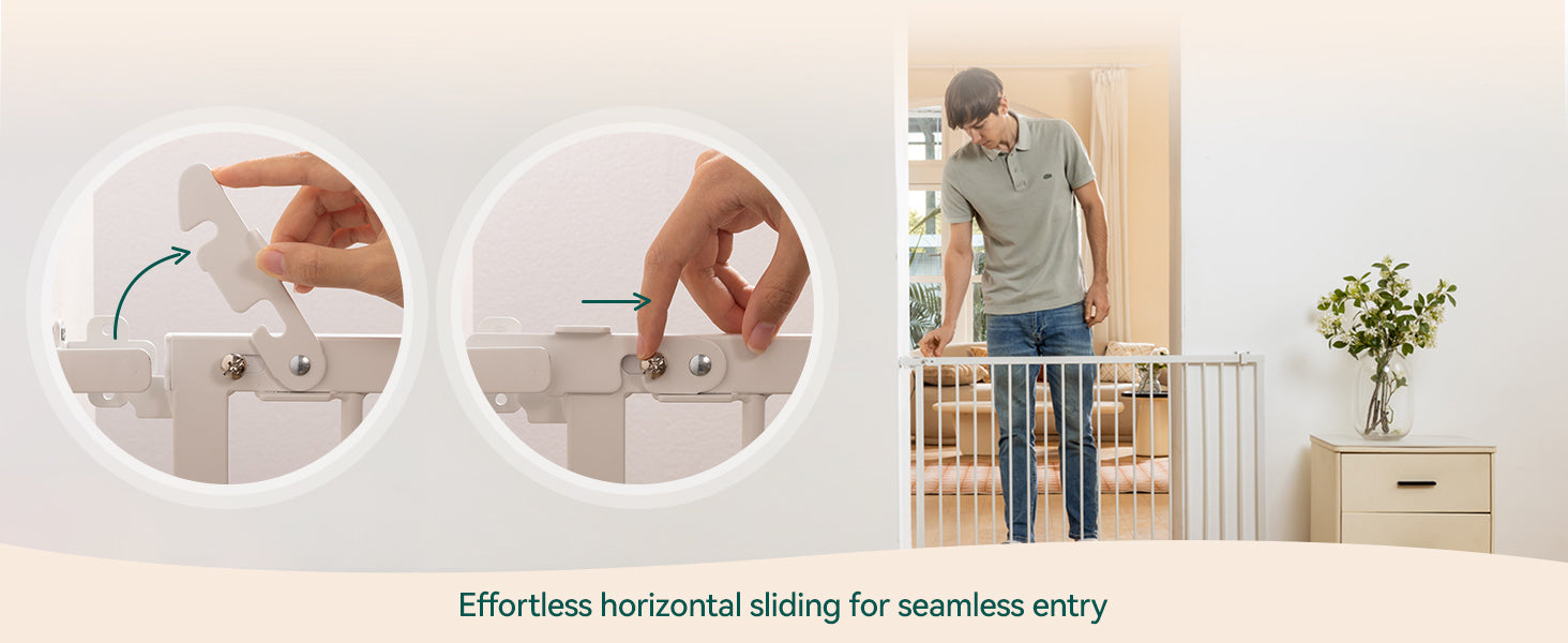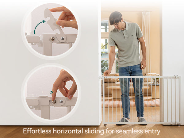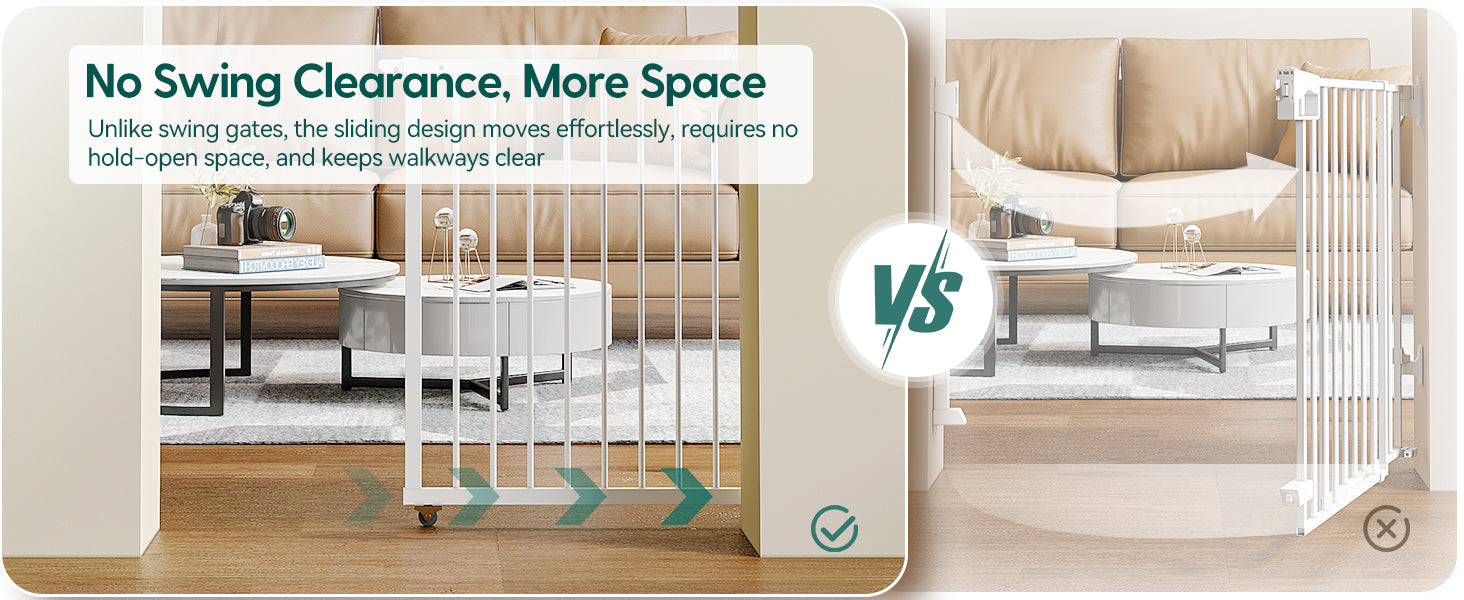 - Space-Saving & Concealable Design: The horizontal sliding mechanism saves space compared to traditional gates. Its wall-mounted design allows it to tuck behind furniture when not in use, ensuring no wasted space and blending effortlessly with any decor.