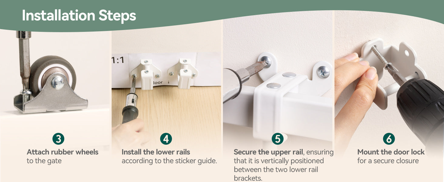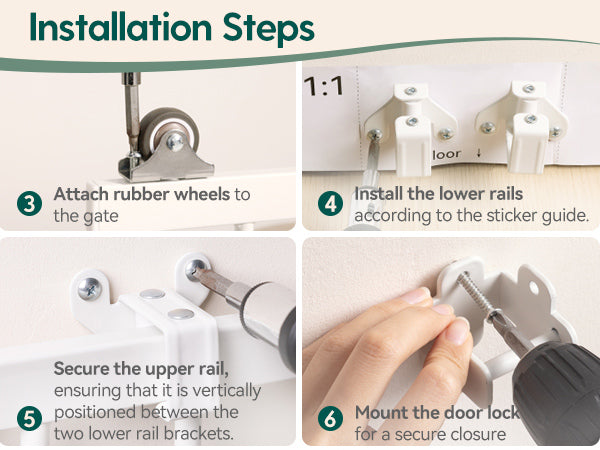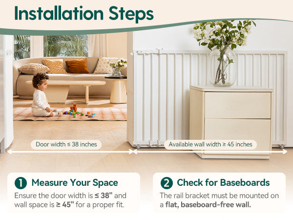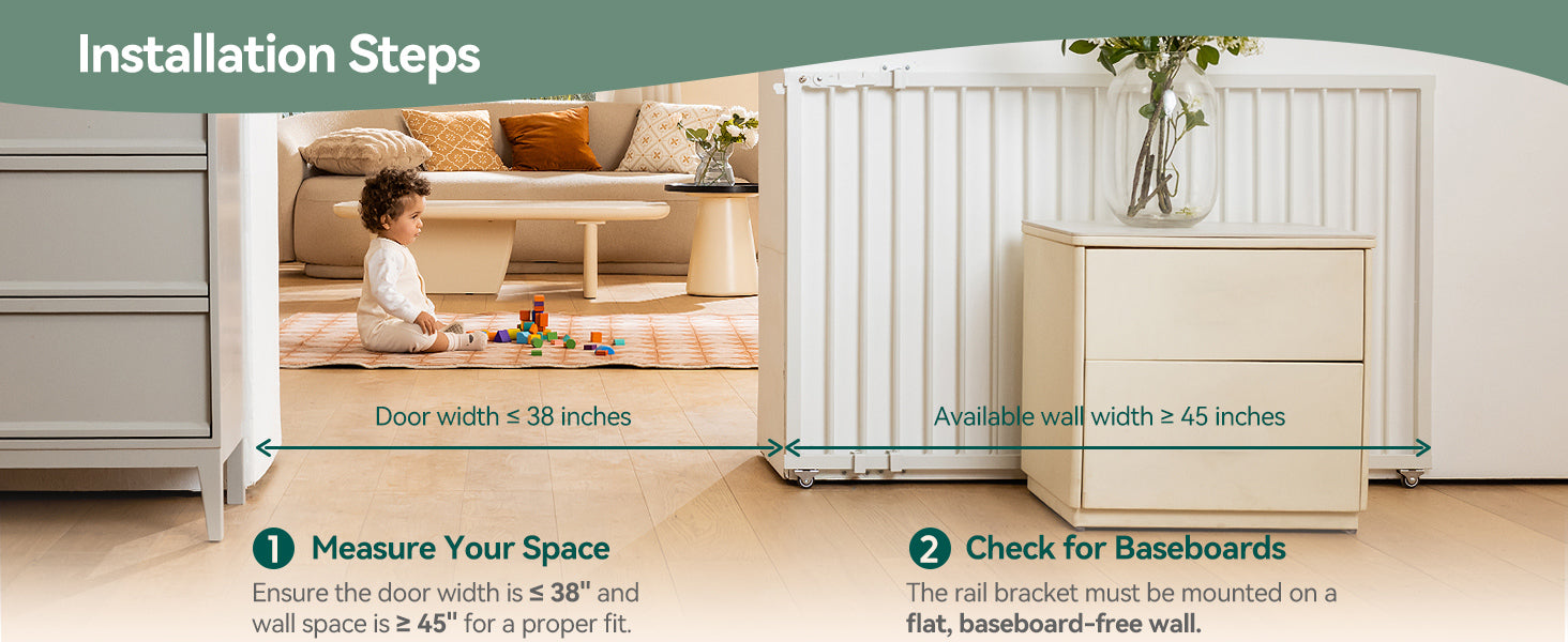 - Secure and Durable Hardware Installation: Made from high-quality steel, this safety gate is built to withstand impacts, ensuring it won't be knocked over. It includes a simple manual with step-by-step instructions for easy setup. Note: Ensure the wall space for the rail bracket is at least 45 inches wide and free of baseboards.