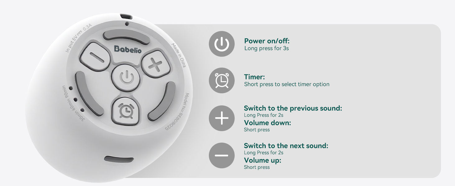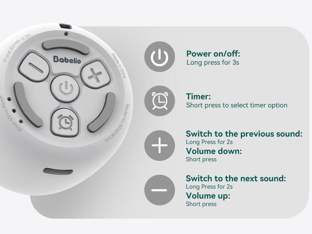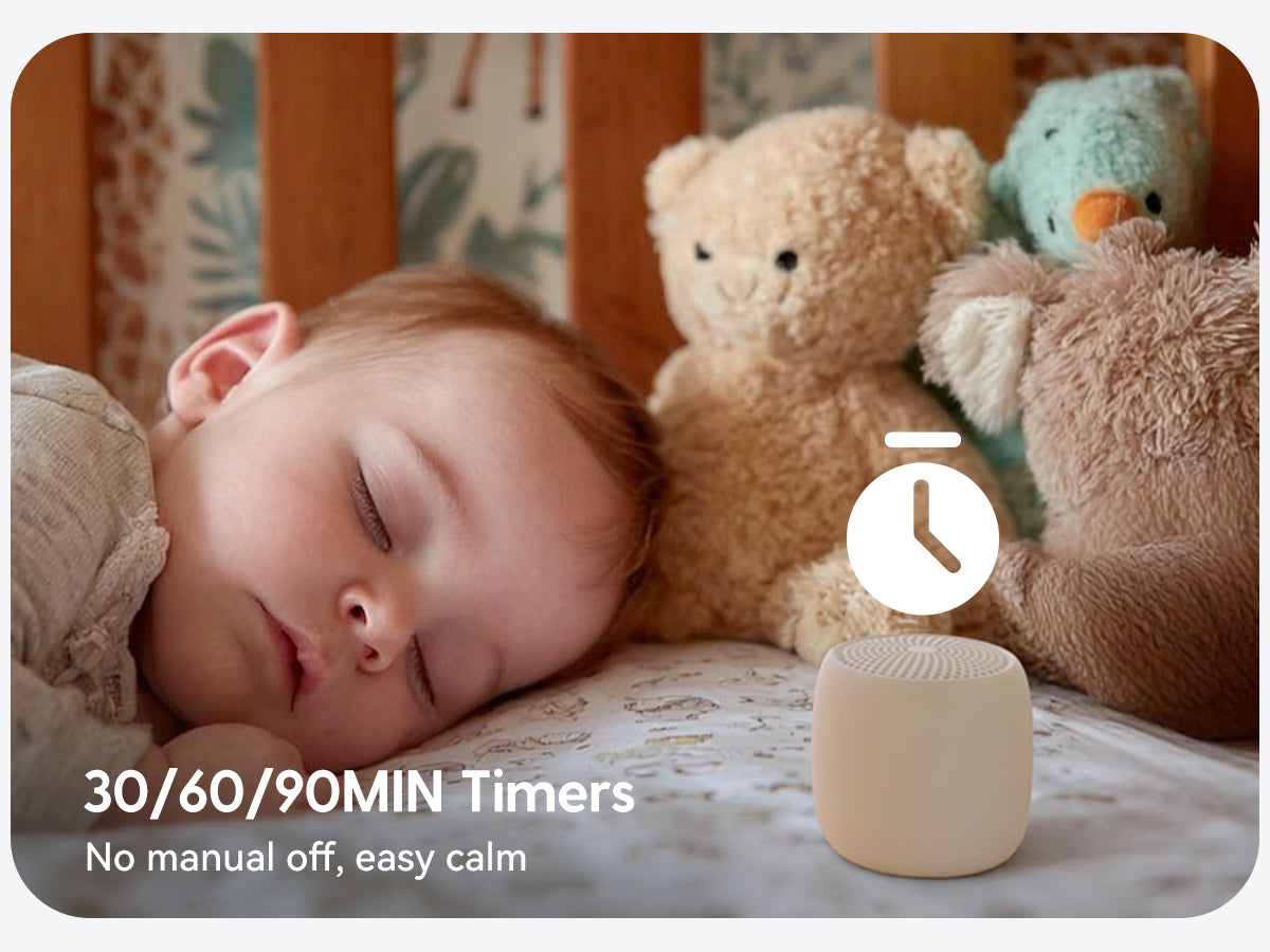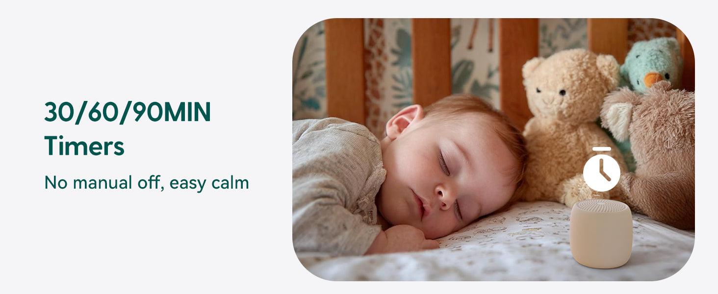 Timer Control — Choose continuous play (green), 30 min (white), or 60 min (blue) with a simple button press—ideal for naps, bedtime, or study.
