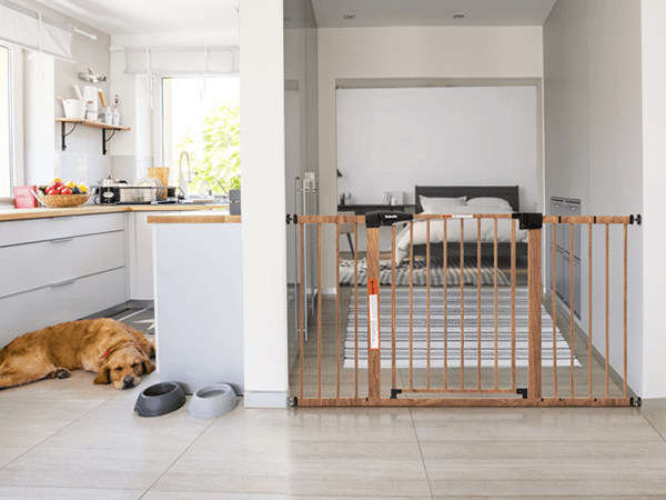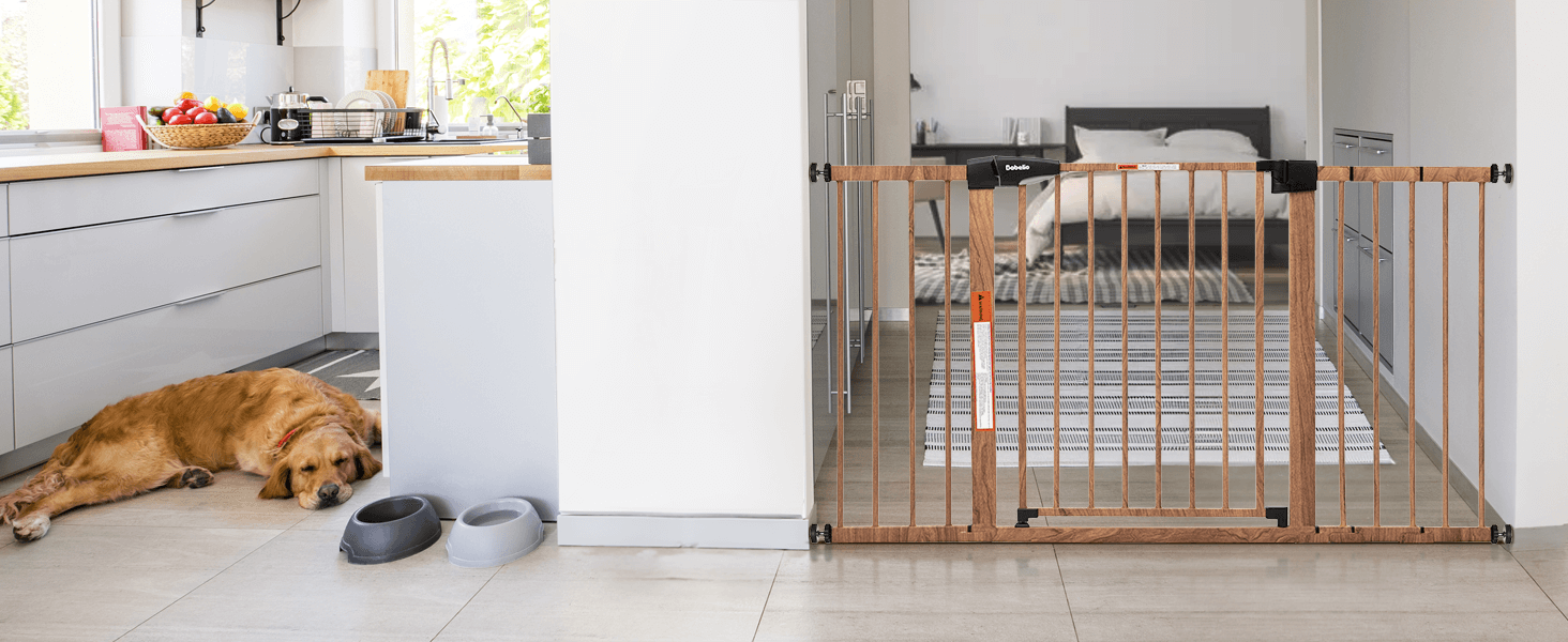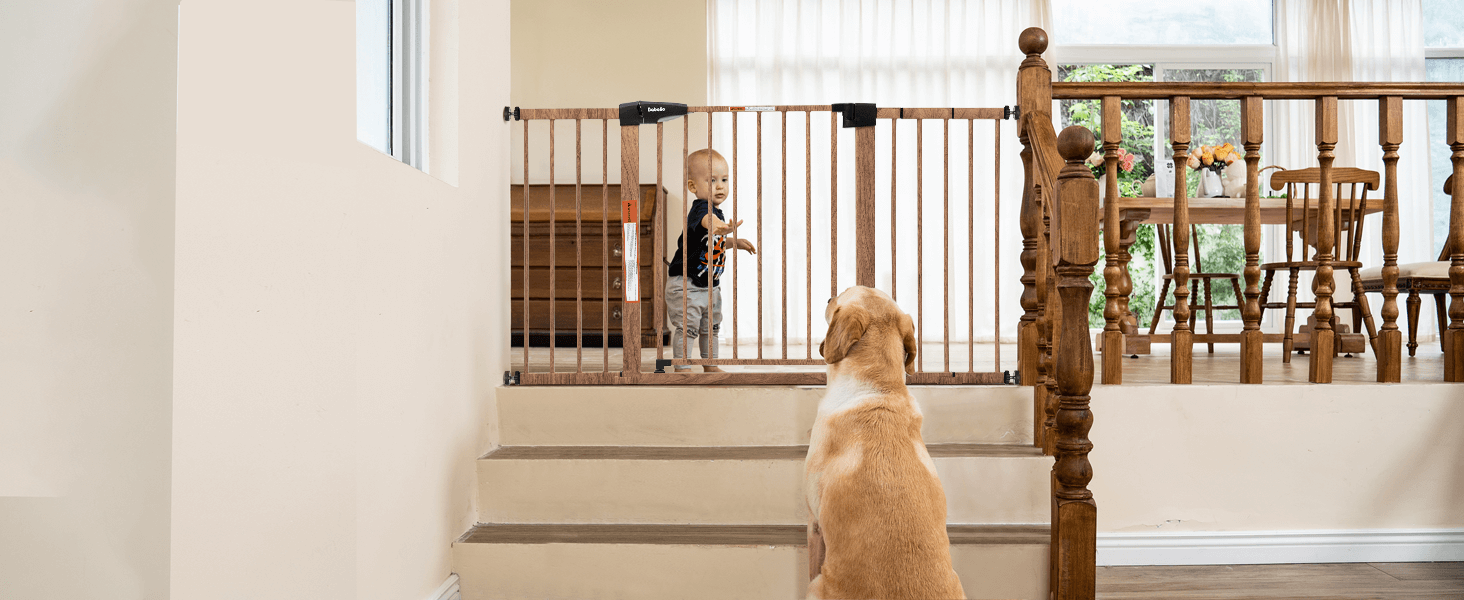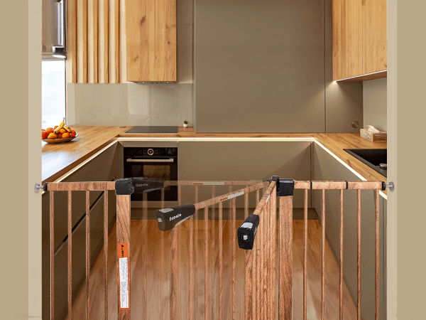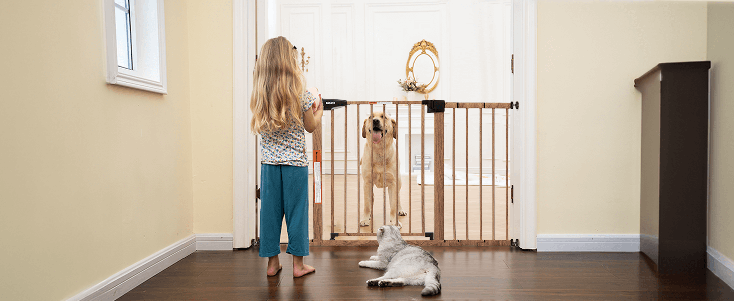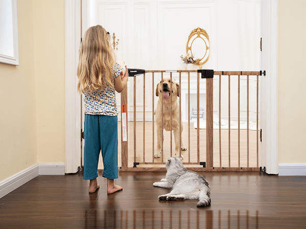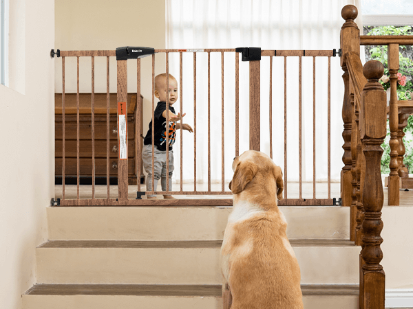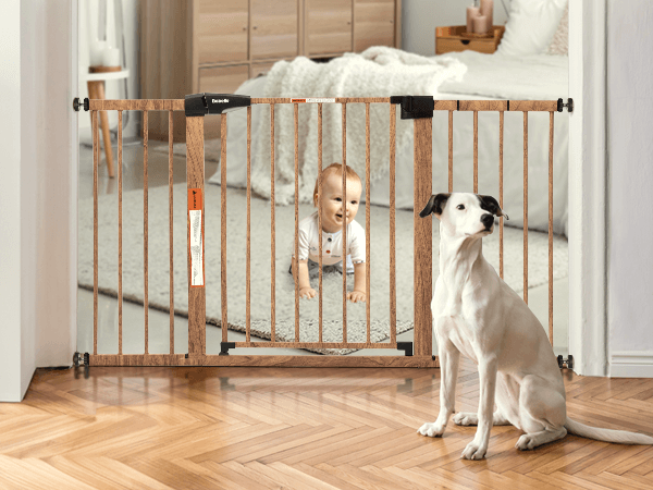 Babelio 29-55 Inch Extra Wide Metal Baby Gate with Wood Pattern is suitable for small and medium-sized pets and can isolate pets and keep them inside the gate.
