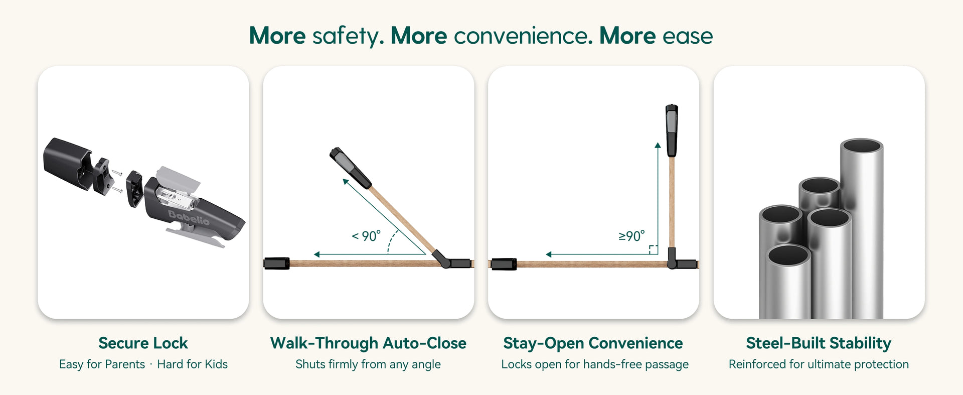 The door closes automatically for safety. Stay-open function allows free access when needed. Opens both ways with a simple one-handed release.