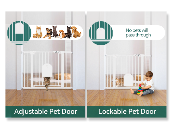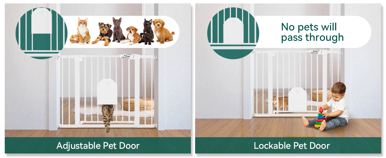 Features a lockable small pet door, allowing your cat or small dog to pass through while keeping babies safely contained. A great solution for multi-pet and child households.