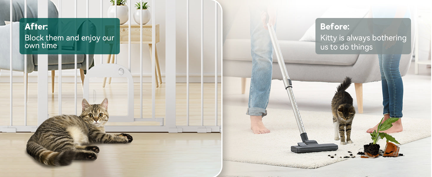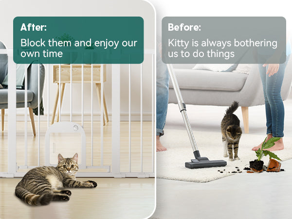 You can open it with one hand, even while holding a baby. The double secure opening system prevents kids or pets open the door. Auto-close pet gate with cat door, no worries about forgetting to lock the safety gate.