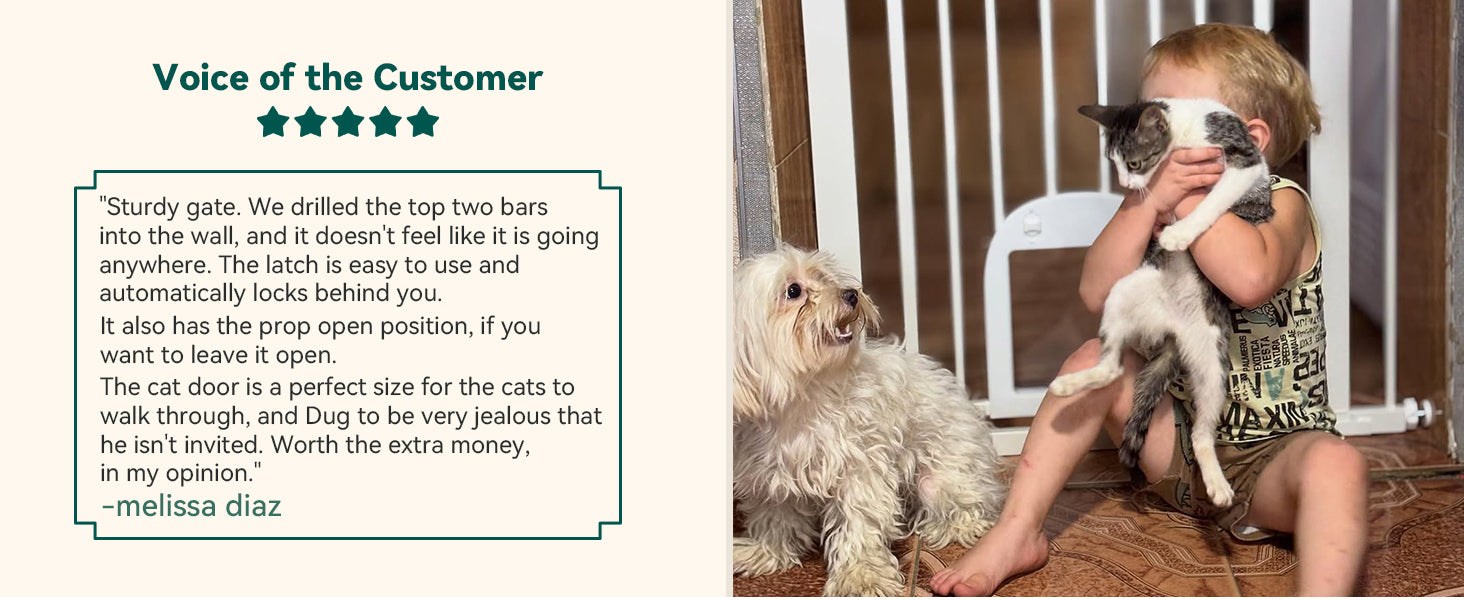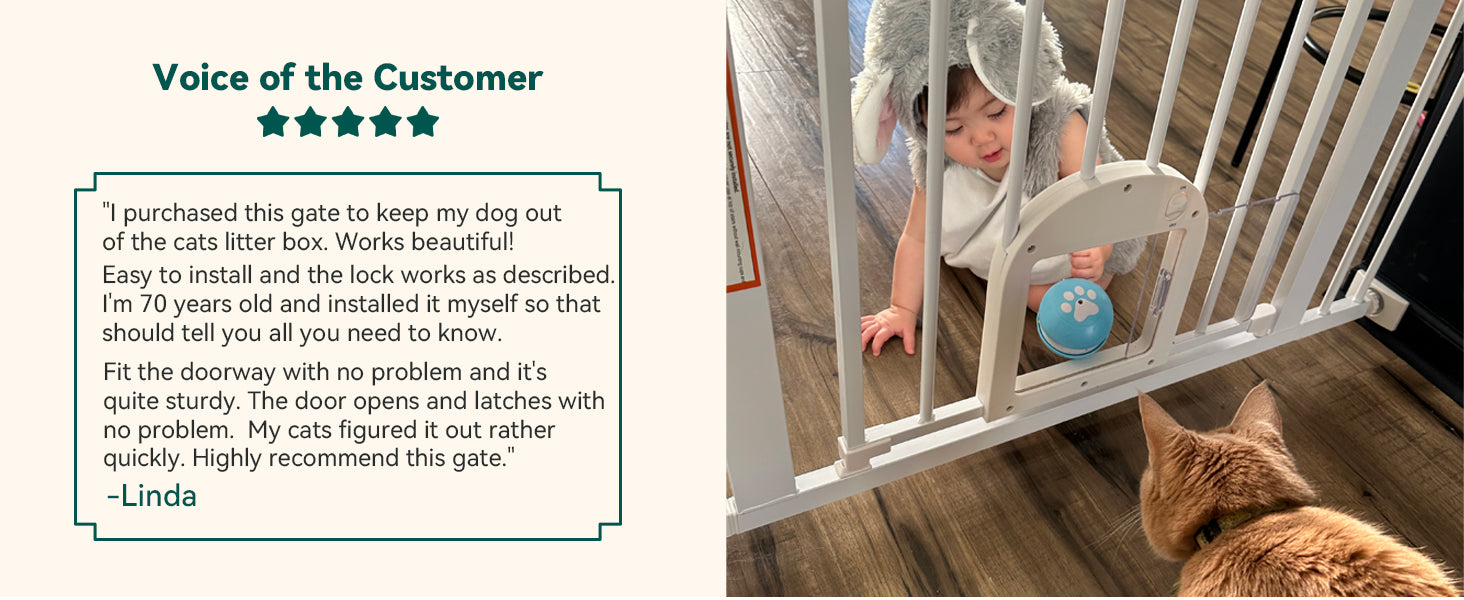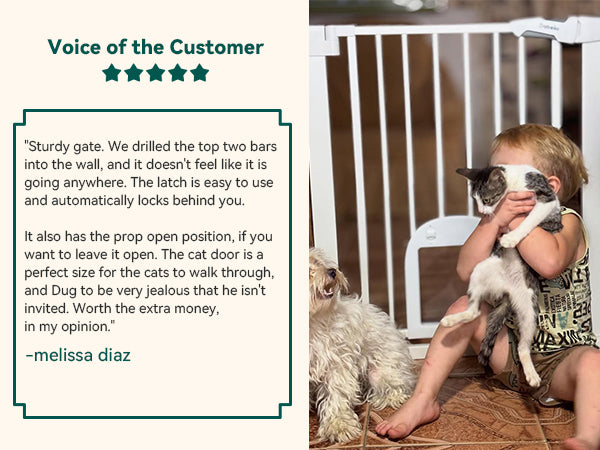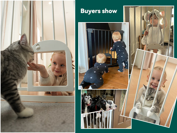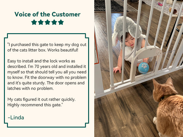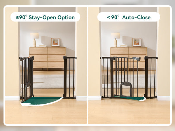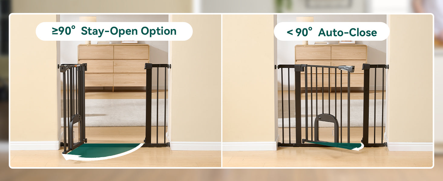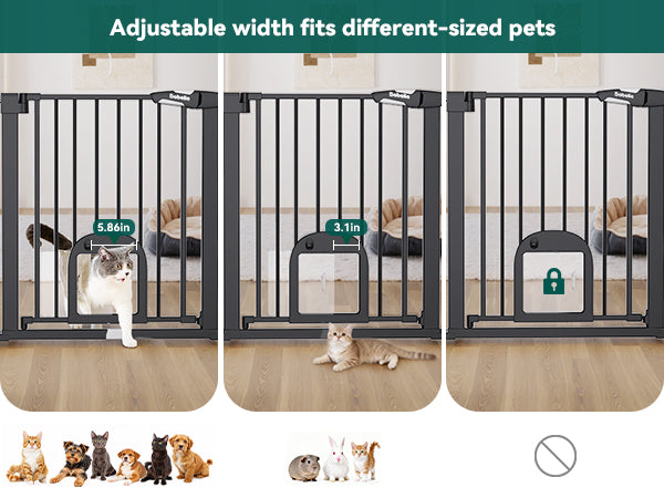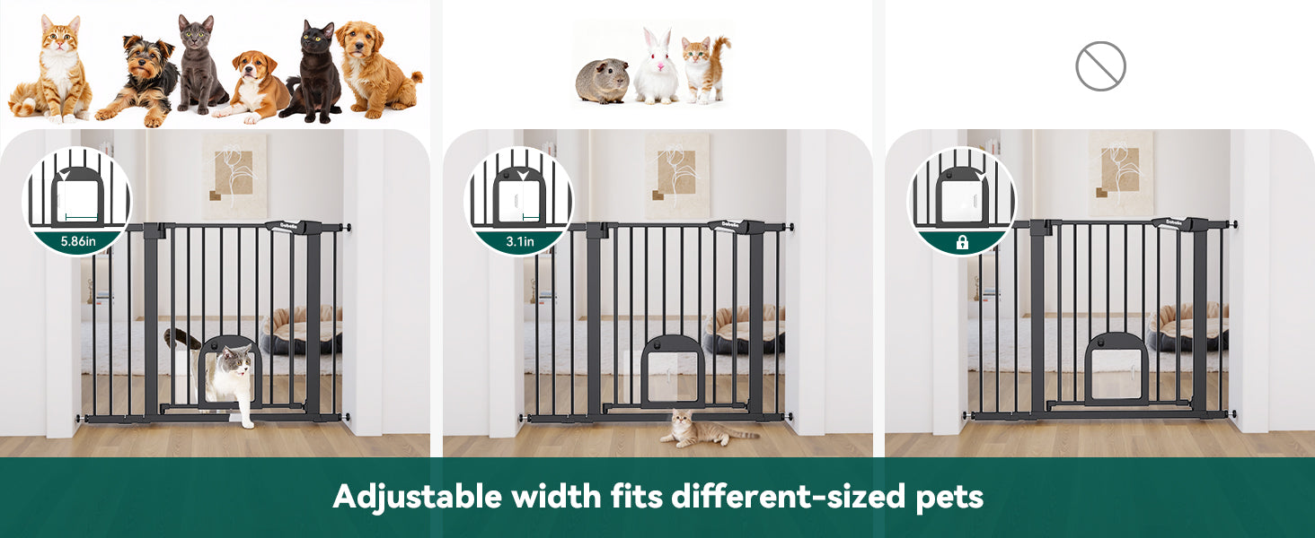 Adjustable Clear Cat Door: Unlike standard gates with metal bar cat doors, the T7 features a adjustable acrylic pet door. It can be locked at different heights or closed completely, giving you total control.