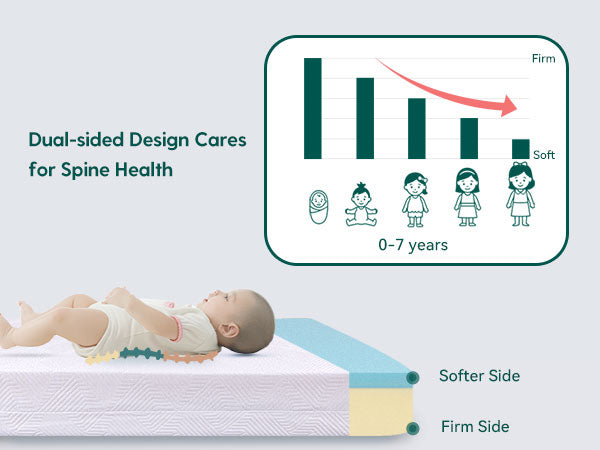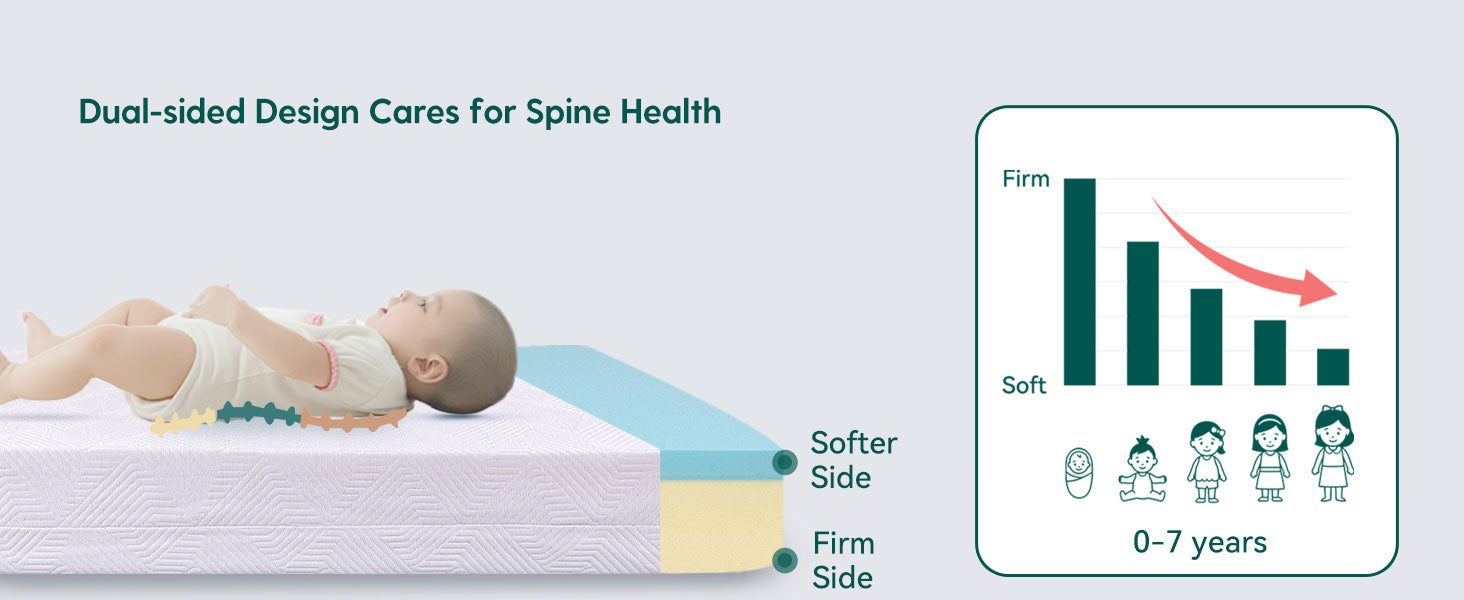 【Dual-Sided Design】Our mattress features a firmer side for infants and a soft memory foam side for toddlers for ultimate comfort and support as your baby grows