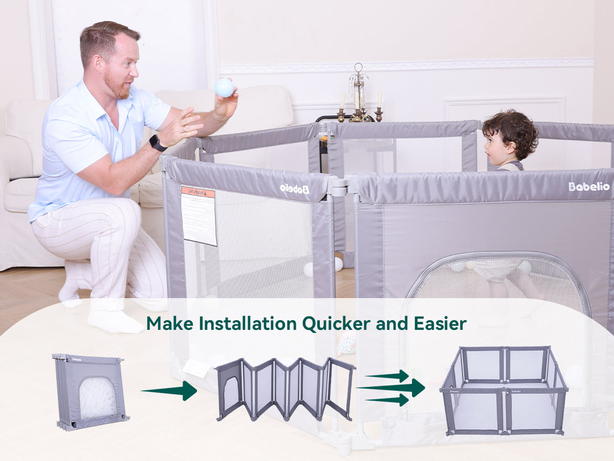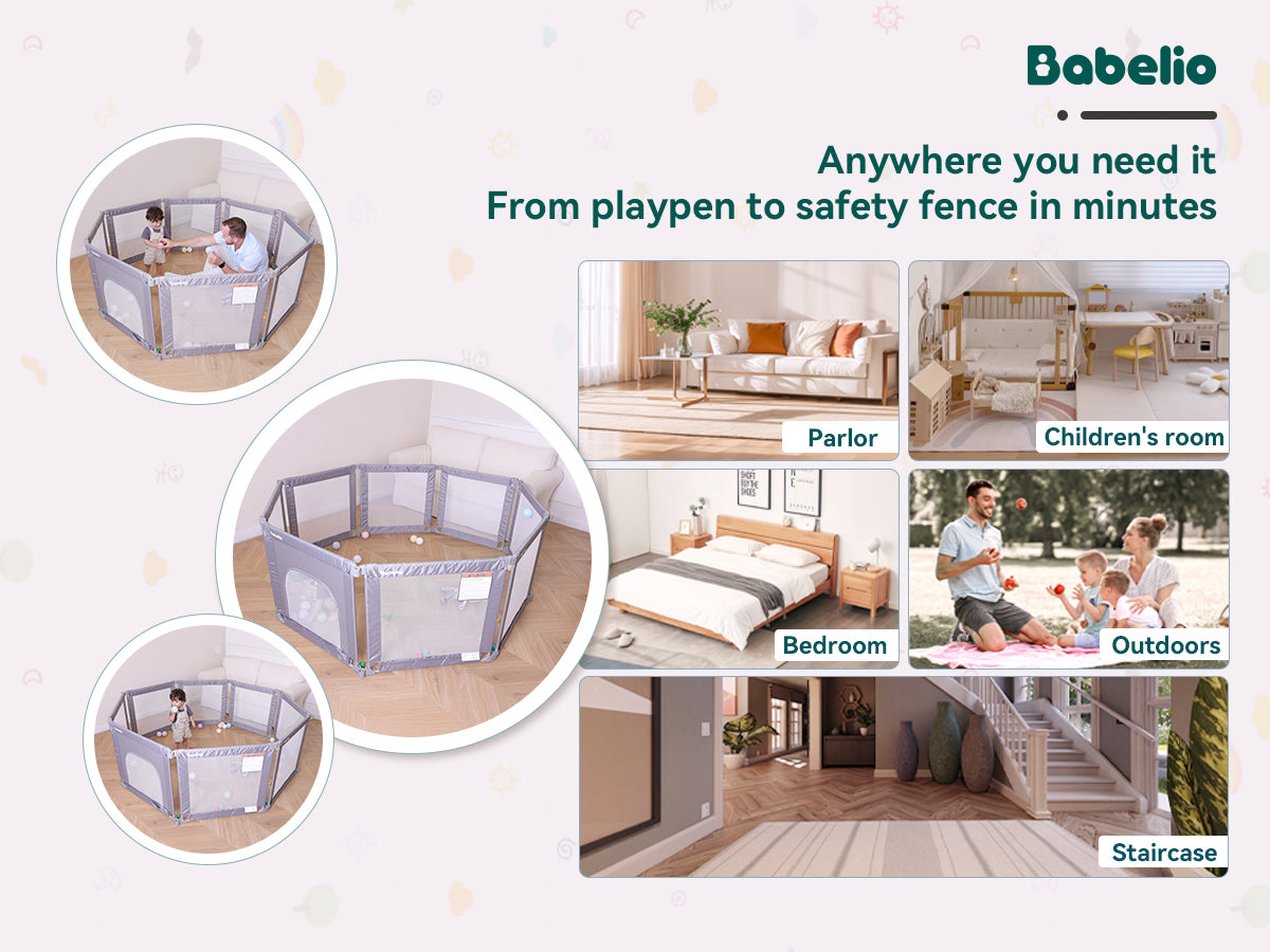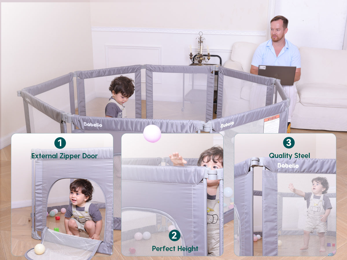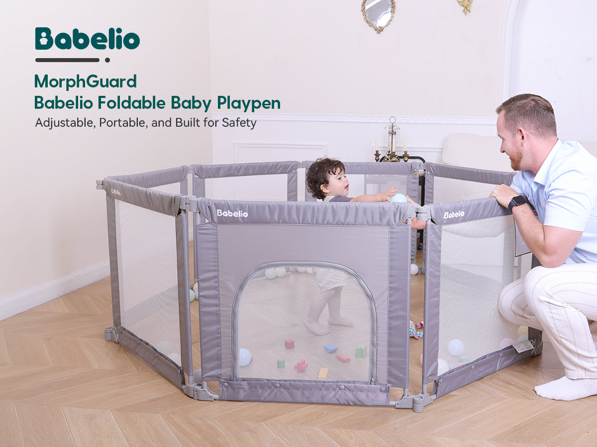 Busy parents know the struggle: keeping your baby safe while trying to manage work, house chores, or just taking a breath. The Babelio Foldable Playpen offers a secure, spacious, and flexible play space for your little one—so you can focus on what matters. With 8 adjustable panels, it fits any room layout and folds down quickly for storage or travel. Durable steel pipes and reinforced mesh walls ensure safety, even for active toddlers. More than just a playpen—it’s your child’s personal playground, and your peace-of-mind solution.